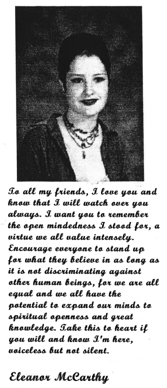 I didn’t know Eleanor too well. But I did know this. She was a very nice person. She was always friendly. Every time I saw her at school this year she always had a big carefree smile on her face no matter what.